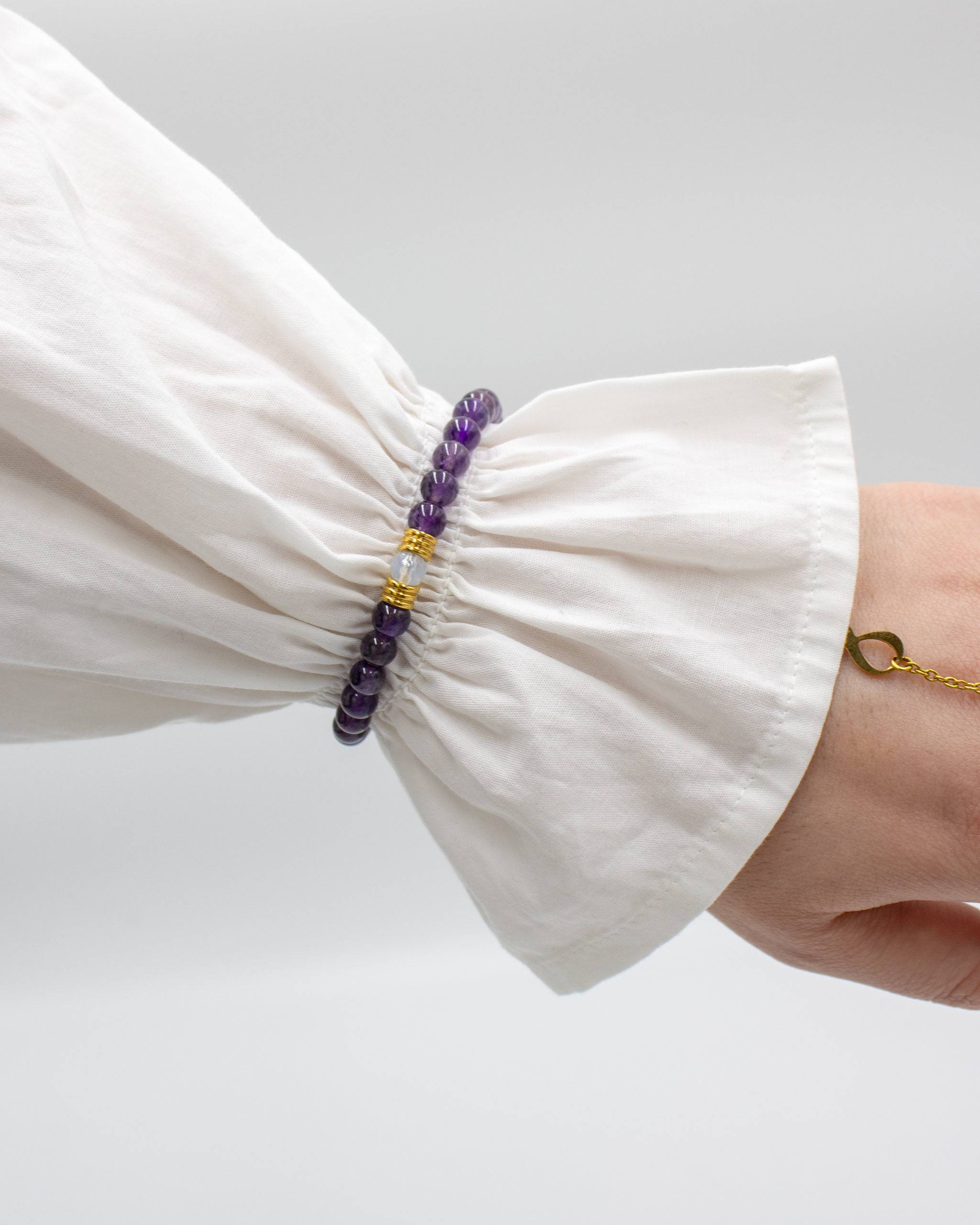 Ατσάλινο βραχιόλι με ημιπολύτιμες χάντρες αμέθυστου, φεγγαρόπετρας και ατσάλινες χάντρες.