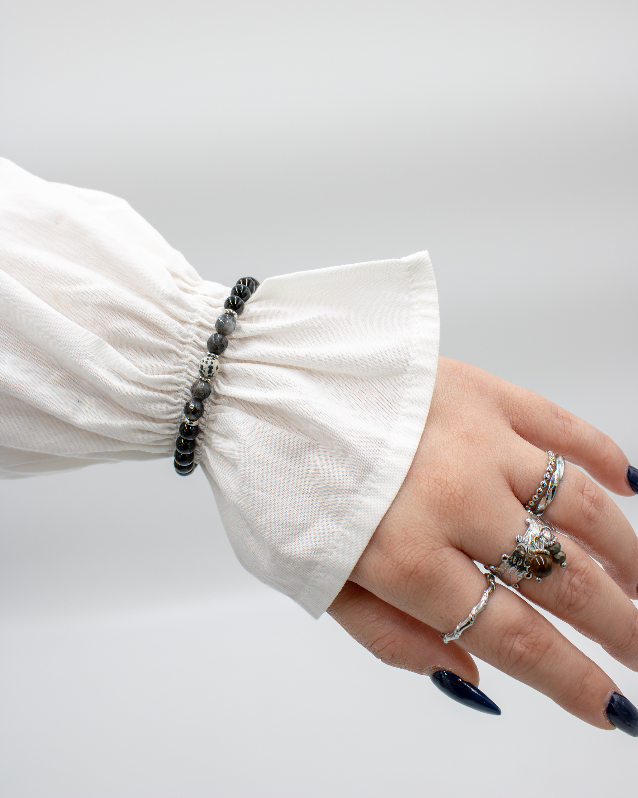Ατσάλινο βραχιόλι με ημιπολύτιμες χάντρες όνυχα, λαμπραντορίτη, ίασπη δαλματίας και ατσάλινες ροδέλες.
