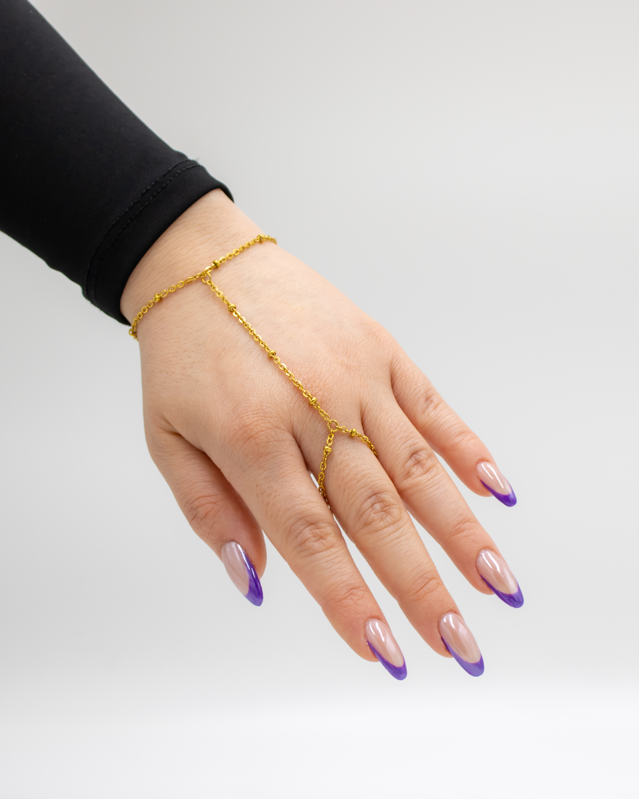 Χειροποίητο βραχιόλι που καταλήγει σε δαχτυλίδι με λεπτή αλυσίδα και μπιλάκια.